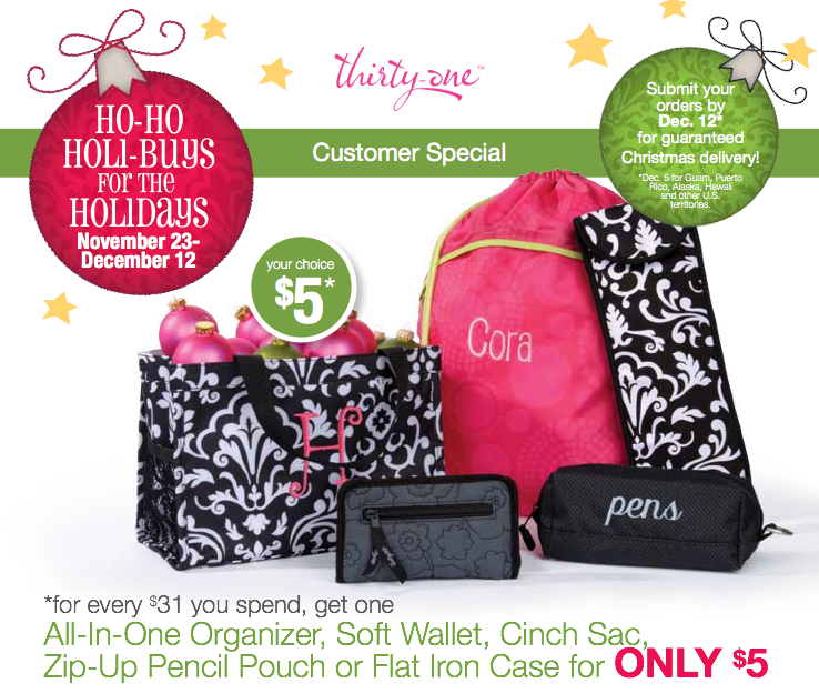 Melissa from Ms. M's Blog is having a Thirty One party just in time to order those holiday presents from the warmth of your own home. No lines, no camping out, just click on the online catalog and shop! The are having a fantastic special. For every $31.00 you spend, you can get one All In One Organizer, Soft Wallet, Cinch Sac, Zip Up Pencil Pouch, or Flat Iron Case for only$ 5.00! The lunch sacs make wonderful gifts! Your package will be delivered in time for Christmas to your home. Don't miss out.